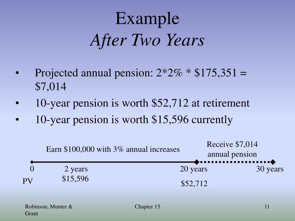 ExampleAfter Two Years • Projected annual pension: 2*2% * $175,351 = $7,014 • 10-year pension is worth $52,712 at retirement • 10-year pension is worth $15,596 currently Receive $7,014 annual pension Earn $100,000 with 3% annual increases 0 2 years 20 years 30 years $15,596 PV $52,712 Chapter 15