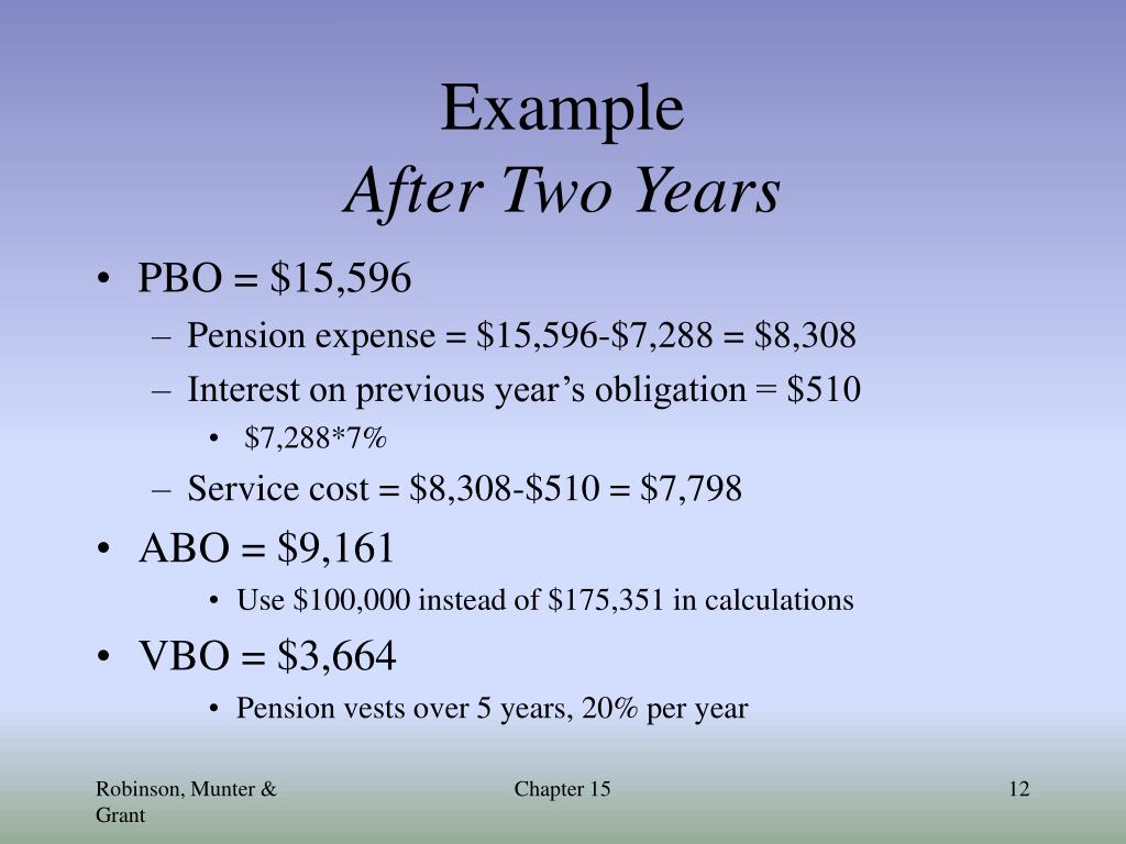 ExampleAfter One Year • In this case, at the end of the first year, service cost = pension liability = pension expense = $7,288, the PBO • ABO excludes all salary increases, $4,156 • Use $100,000 instead of $175,351 in calculations • VBO is 20% of ABO, $831 • Pension vests over 5 years, 20% per year Chapter 15
