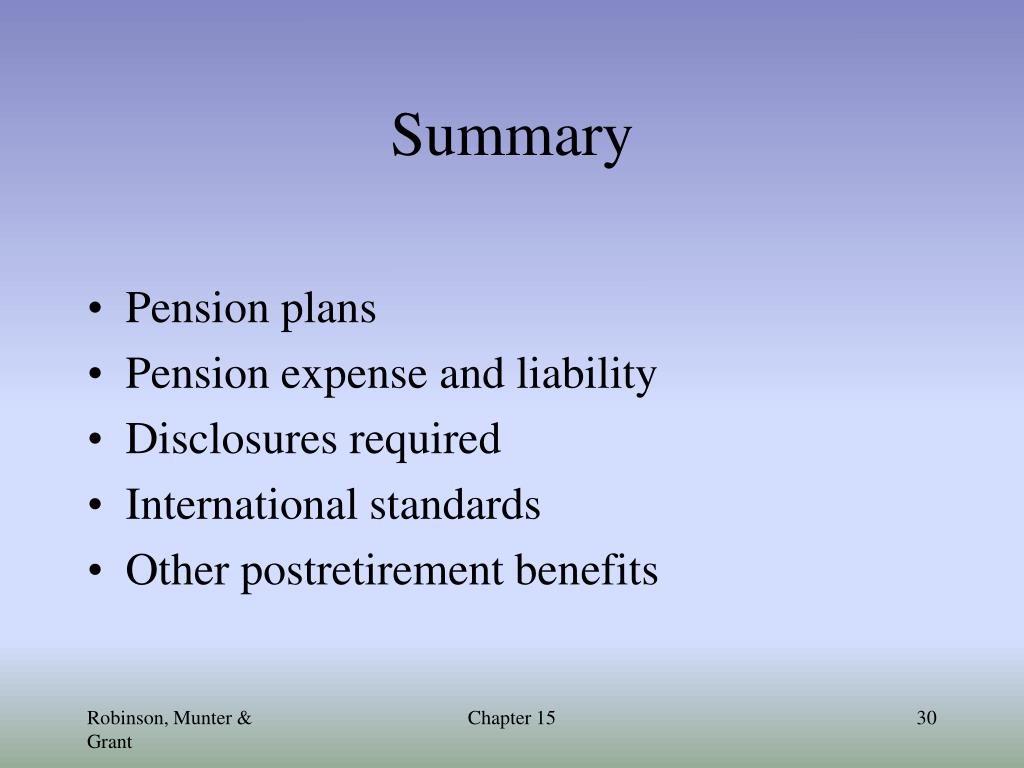 Summary • Pension plans • Pension expense and liability • Disclosures required • International standards • Other postretirement benefits Chapter 15