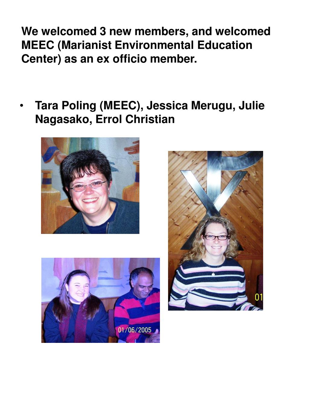 We welcomed 3 new members, and welcomed MEEC (Marianist Environmental Education Center) as an ex officio member. • Tara Poling (MEEC), Jessica Merugu, Julie Nagasako, Errol Christian