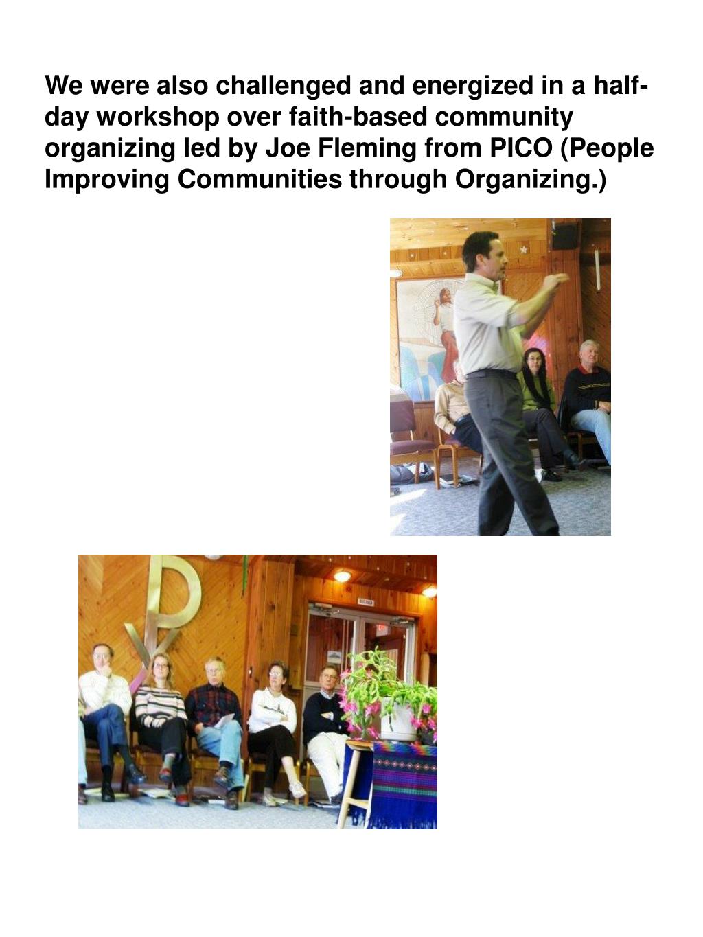 We were also challenged and energized in a half-day workshop over faith-based community organizing led by Joe Fleming from PICO (People Improving Communities through Organizing.)