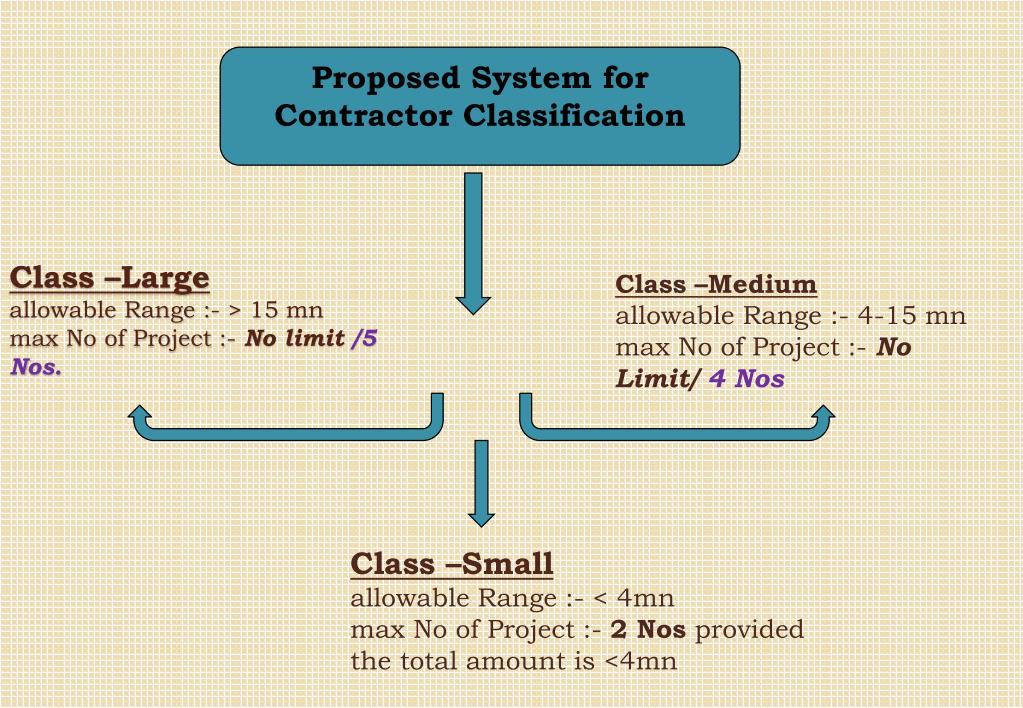 Class –Largeallowable Range :- > 15 mnmax No of Project :- No limit /5 Nos. Proposed System for Contractor Classification Class –Mediumallowable Range :- 4-15 mnmax No of Project :- No Limit/ 4 Nos Class –Smallallowable Range :- < 4mnmax No of Project :- 2 Nosprovided the total amount is <4mn