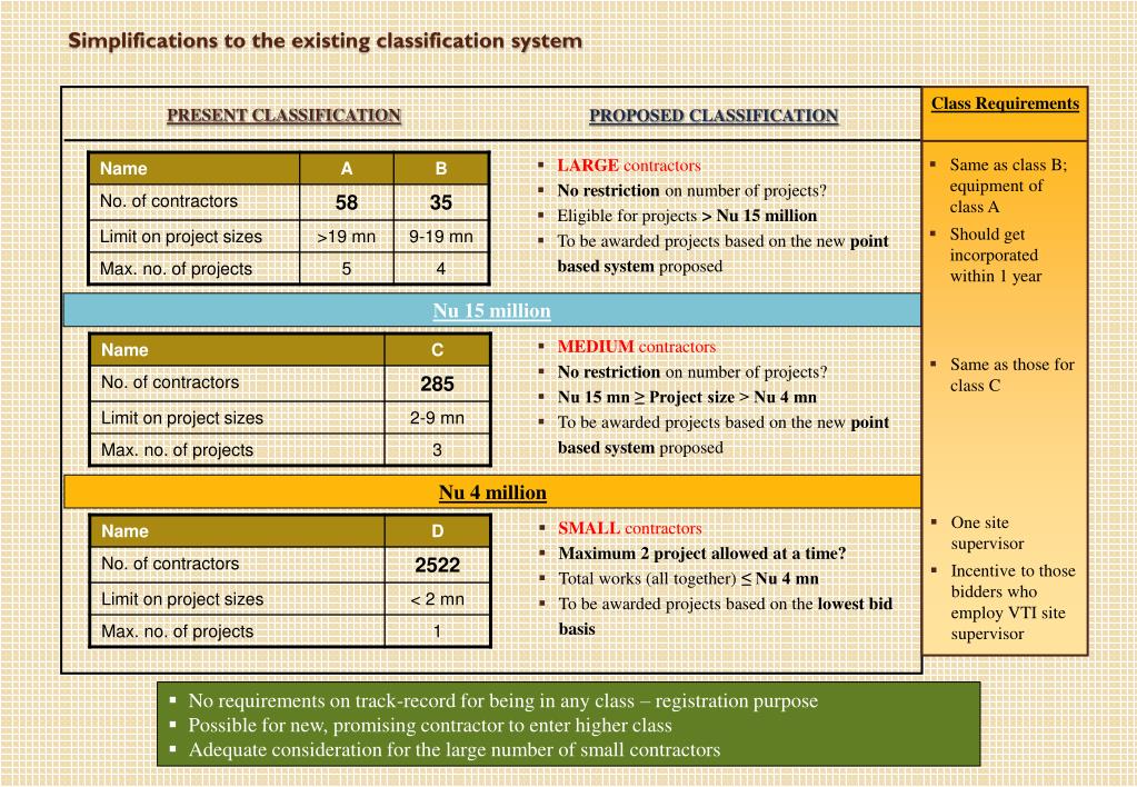 Simplifications to the existing classification system Class Requirements PRESENT CLASSIFICATION PROPOSED CLASSIFICATION • LARGE contractors • No restriction on number of projects? • Eligible for projects > Nu 15 million • To be awarded projects based on the new point based system proposed • Same as class B; equipment of class A • Should get incorporated within 1 year Nu 15 million • MEDIUM contractors • No restriction on number of projects? • Nu 15 mn ≥ Project size > Nu 4 mn • To be awarded projects based on the new point based system proposed • Same as those for class C Nu 4 million • One site supervisor • Incentive to those bidders who employ VTI site supervisor • SMALL contractors • Maximum 2 project allowed at a time? • Total works (all together) ≤ Nu 4 mn • To be awarded projects based on the lowest bid basis • No requirements on track-record for being in any class – registration purpose • Possible for new, promising contractor to enter higher class • Adequate consideration for the large number of small contractors