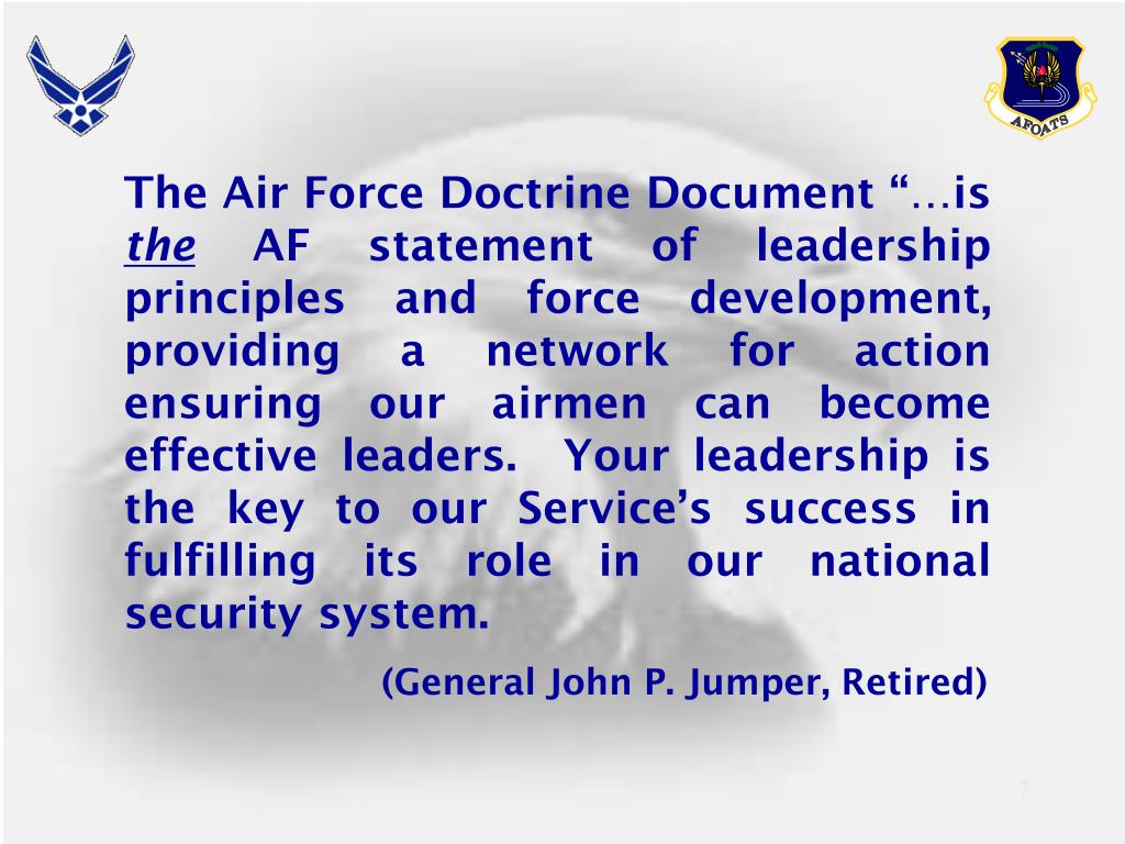 The Air Force Doctrine Document “…is the AF statement of leadership principles and force development, providing a network for action ensuring our airmen can become effective leaders. Your leadership is the key to our Service’s success in fulfilling its role in our national security system. (General John P. Jumper, Retired)