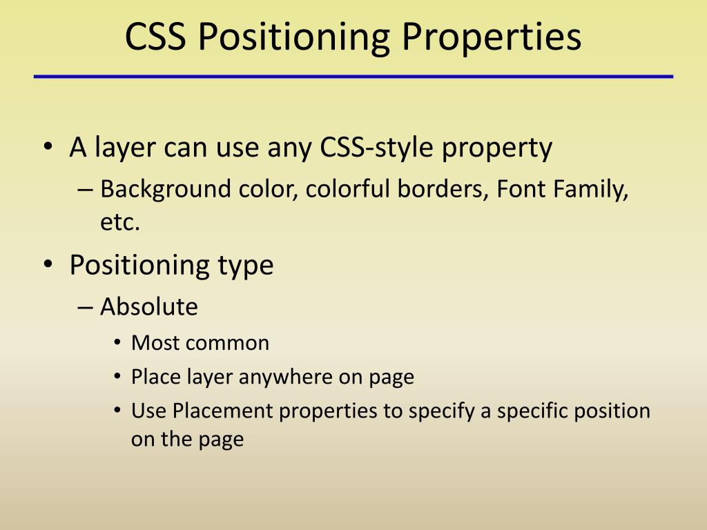 CSS Positioning Properties • A layer can use any CSS-style property • Background color, colorful borders, Font Family, etc. • Positioning type • Absolute • Most common • Place layer anywhere on page • Use Placement properties to specify a specific position on the page