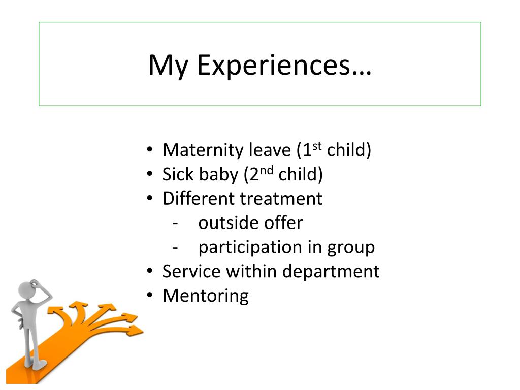 My Experiences… • Maternity leave (1st child) • Sick baby (2nd child) • Different treatment • outside offer • participation in group • Service within department • Mentoring