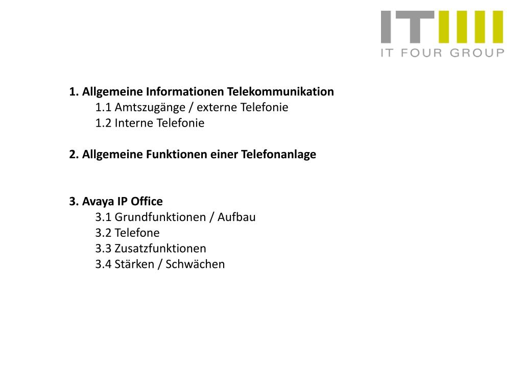 1. Allgemeine Informationen Telekommunikation • 1.1 Amtszugänge / externe Telefonie • 1.2 Interne Telefonie • 2. Allgemeine Funktionen einer Telefonanlage • 3. Avaya IP Office • 3.1 Grundfunktionen / Aufbau • 3.2 Telefone • 3.3 Zusatzfunktionen • 3.4 Stärken / Schwächen