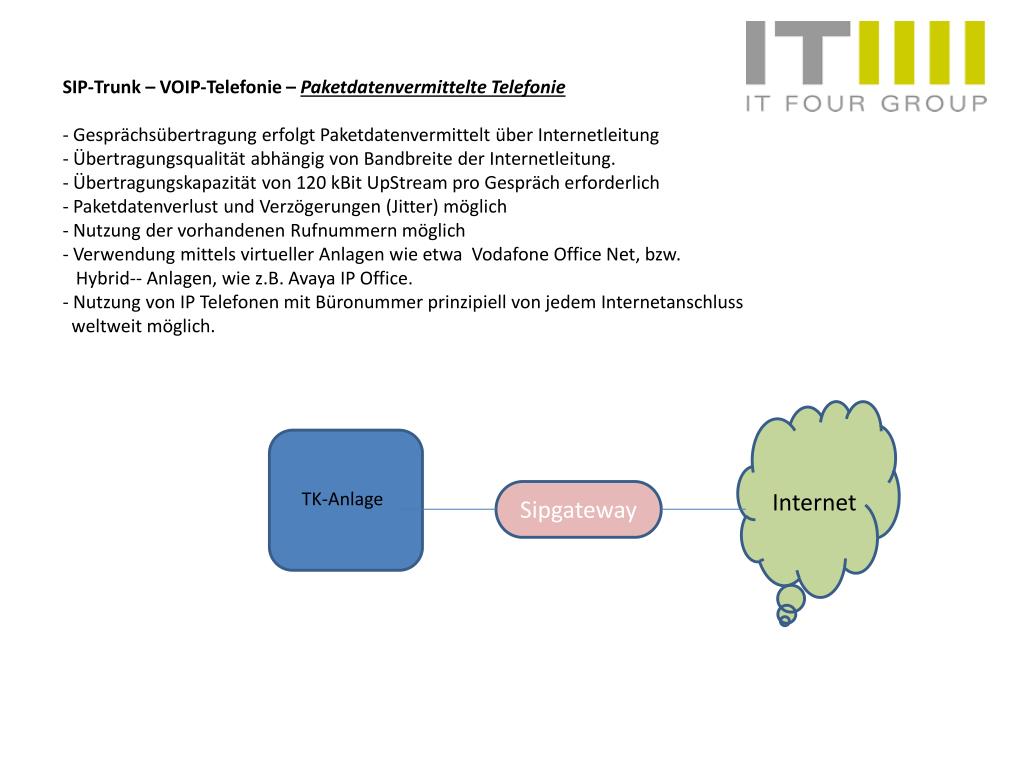 SIP-Trunk – VOIP-Telefonie – Paketdatenvermittelte Telefonie • - Gesprächsübertragung erfolgt Paketdatenvermittelt über Internetleitung • - Übertragungsqualität abhängig von Bandbreite der Internetleitung. • - Übertragungskapazität von 120 kBitUpStreampro Gespräch erforderlich • - Paketdatenverlust und Verzögerungen (Jitter) möglich • - Nutzung der vorhandenen Rufnummern möglich • - Verwendung mittels virtueller Anlagen wie etwa Vodafone Office Net, bzw. • Hybrid-- Anlagen, wiez.B. Avaya IP Office. • - Nutzung von IP Telefonen mit Büronummer prinzipiell von jedem Internetanschluss • weltweit möglich. TK-Anlage Sipgateway Internet