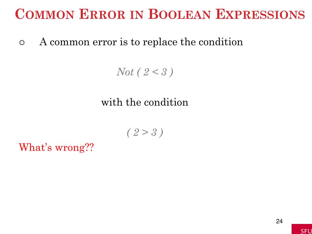 Common Error in Boolean Expressions • A common error is to replace the condition Not ( 2 < 3 ) with the condition ( 2 > 3 ) What’s wrong??