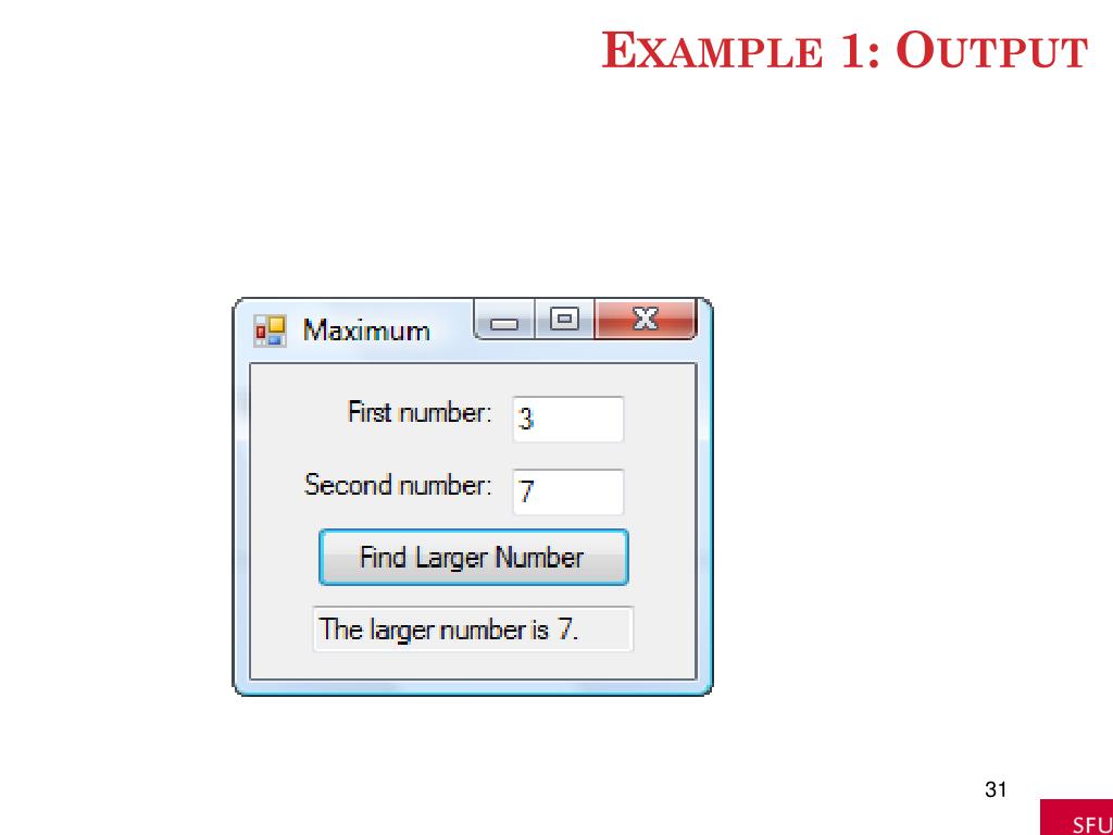 Example 1: Code Private SubbtnFindLarger_Click(...) _ HandlesbtnFindLarger.Click Dim num1, num2, largerNumAs Double num1 = CDbl(txtFirstNum.Text) num2 = CDbl(txtSecondNum.Text) If num1 > num2 Then largerNum = num1 Else largerNum = num2 End If txtResult.Text = "The larger number is " & largerNum End Sub What happens?