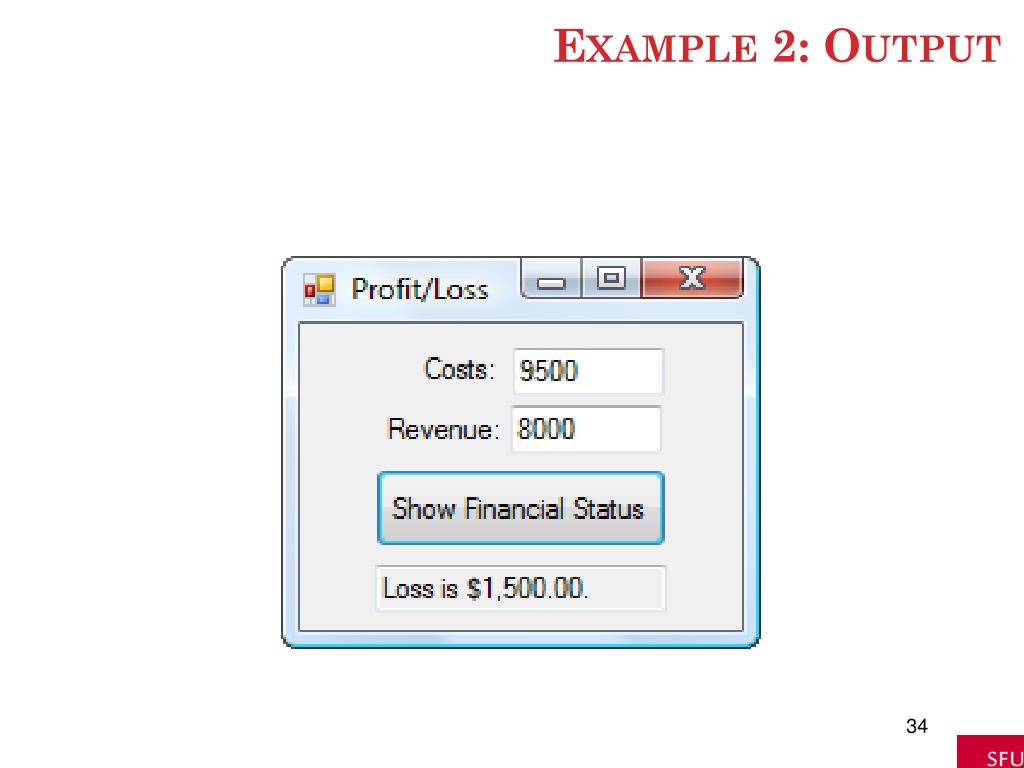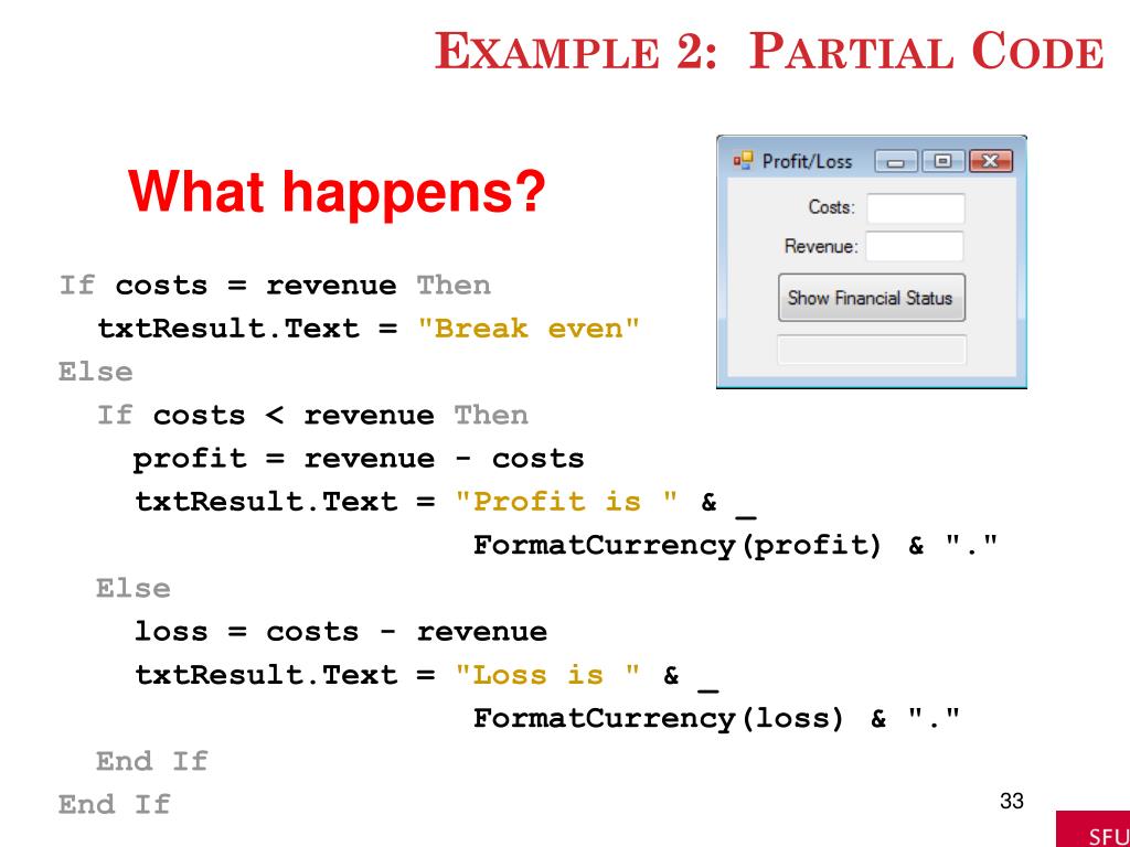 Example 2: Partial Code If costs = revenue Then txtResult.Text = "Break even" Else If costs < revenue Then profit = revenue - costs txtResult.Text = "Profit is " & _ FormatCurrency(profit) & "." Else loss = costs - revenue txtResult.Text = "Loss is " & _ FormatCurrency(loss) & "." End If End If What happens?