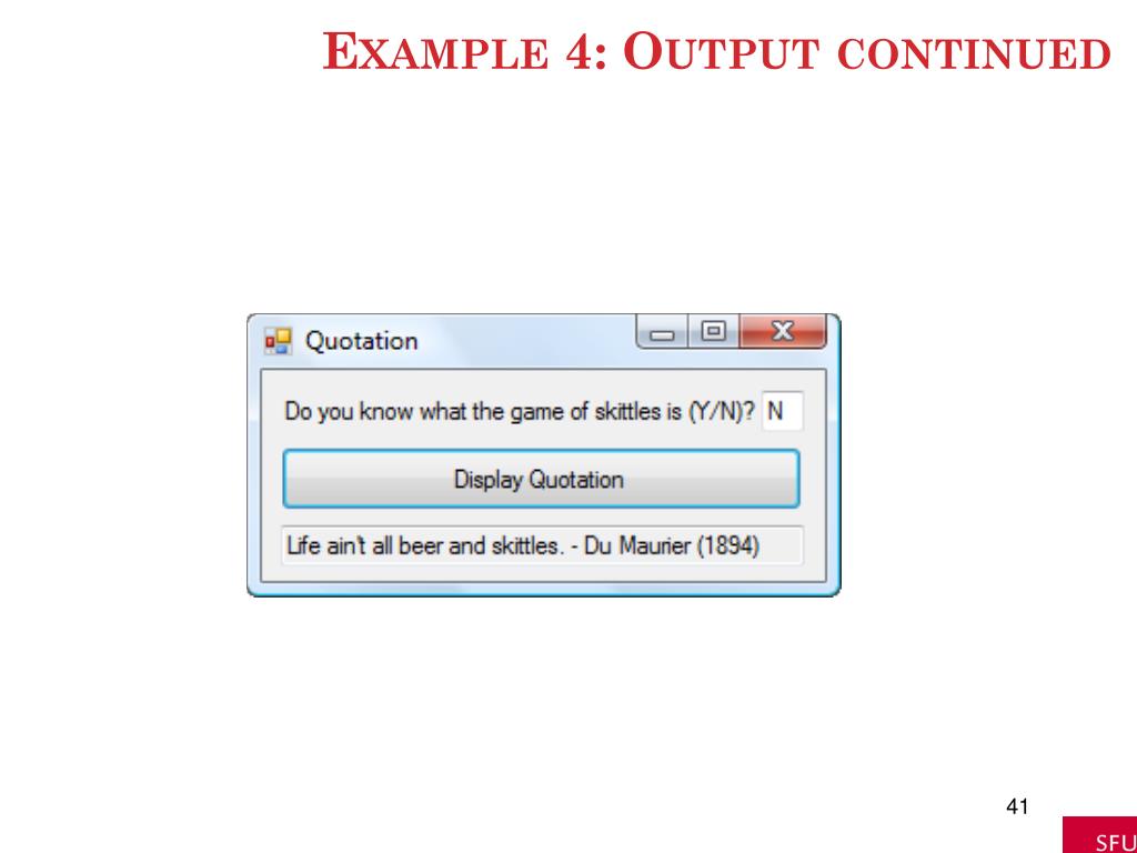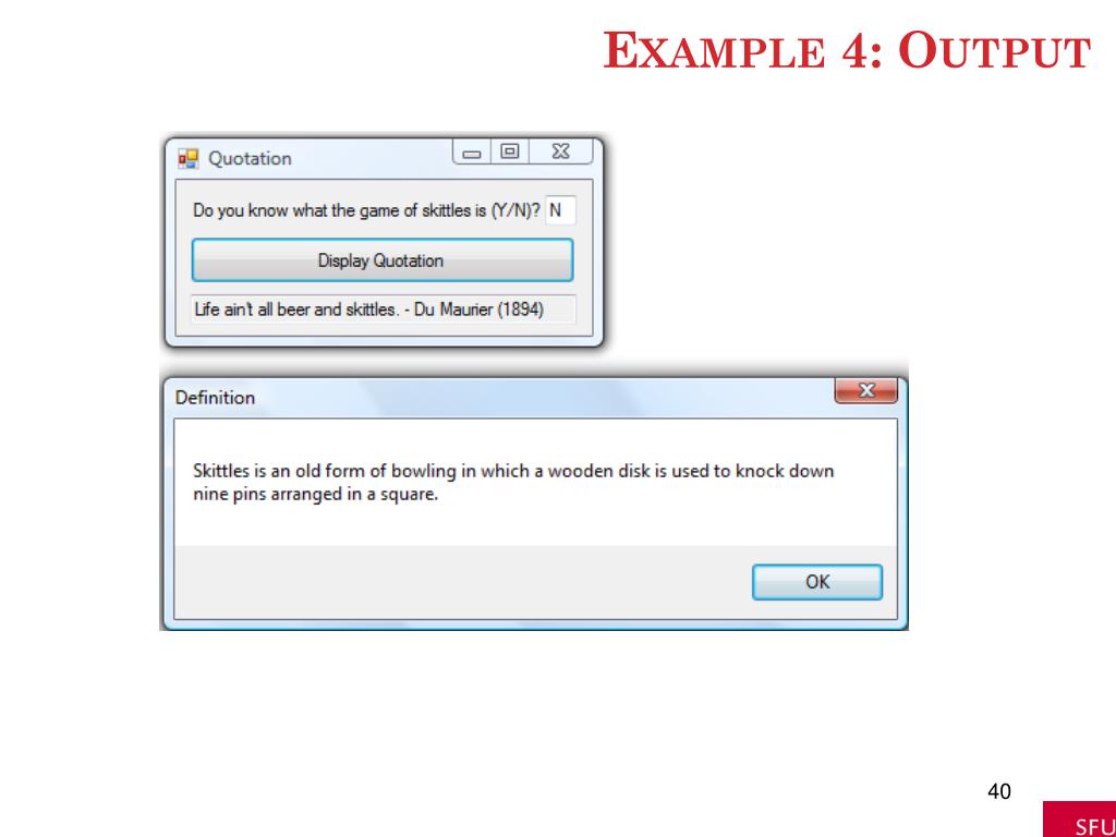 Example 4 Private SubbtnDisplay_Click(...) _ HandlesbtnDisplay.Click Dim message As String message = "Skittles is an old form of bowling in " _ & "which a wooden disk is used to knock down nine" _ & " pins arranged in a square." IftxtAnswer.Text.ToUpper = "N"Then MessageBox.Show(message, "") End If txtQuote.Text = "Life ain't all beer and skittles.“ txtQuote.Text &= " – Du Maurier (1894)." End Sub What happens?