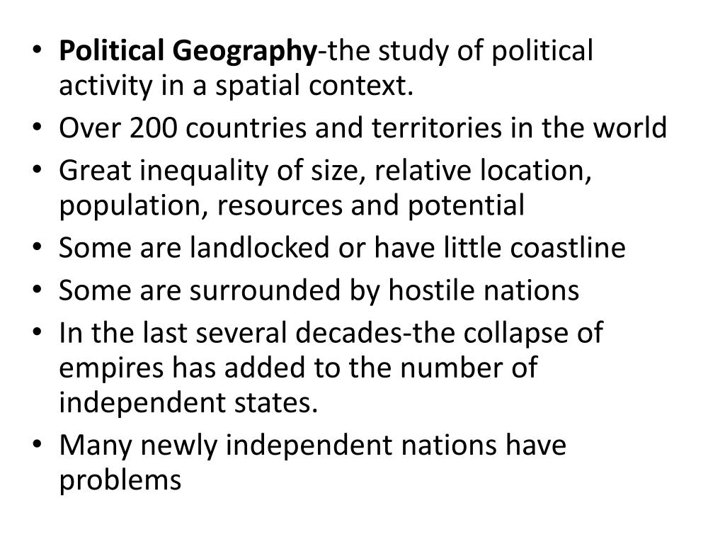 Political Geography-the study of political activity in a spatial context. • Over 200 countries and territories in the world • Great inequality of size, relative location, population, resources and potential • Some are landlocked or have little coastline • Some are surrounded by hostile nations • In the last several decades-the collapse of empires has added to the number of independent states. • Many newly independent nations have problems