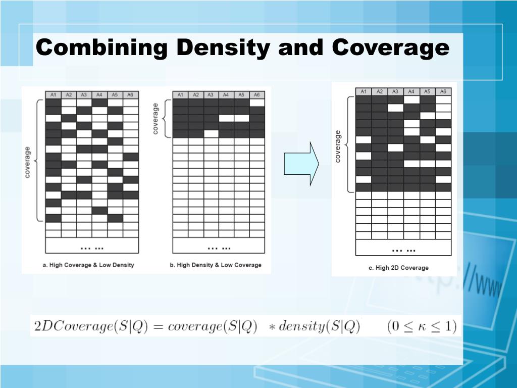 Density Statistics • Coverage measures “vertical completeness” of the answer set • “horizontal completeness” is important too – quality of the individual answers Density statistics measures the horizontal completeness of the individual answer tuples