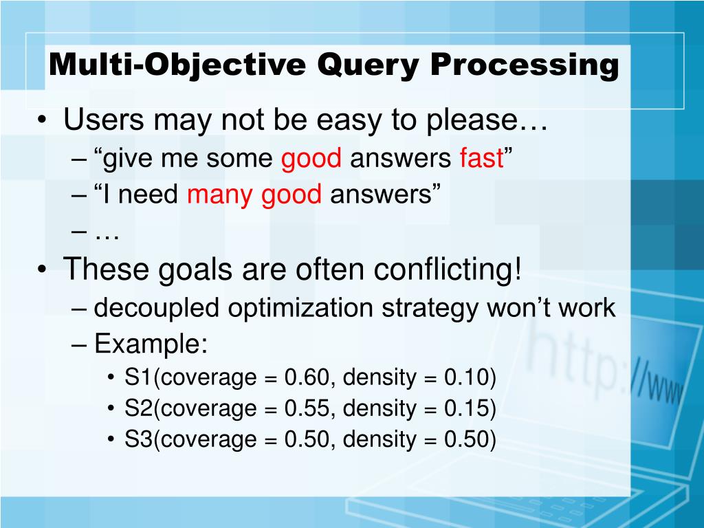 Multi-Objective Query Processing • Users may not be easy to please… • “give me some good answers fast” • “I need manygood answers” • … • These goals are often conflicting! • decoupled optimization strategy won’t work • Example: • S1(coverage = 0.60, density = 0.10) • S2(coverage = 0.55, density = 0.15) • S3(coverage = 0.50, density = 0.50)