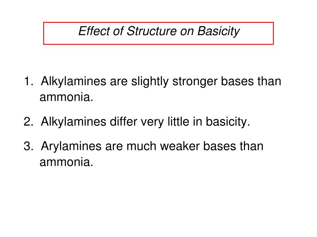 Effect of Structure on Basicity • 1. Alkylamines are slightly stronger bases than ammonia. • 2. Alkylamines differ very little in basicity.