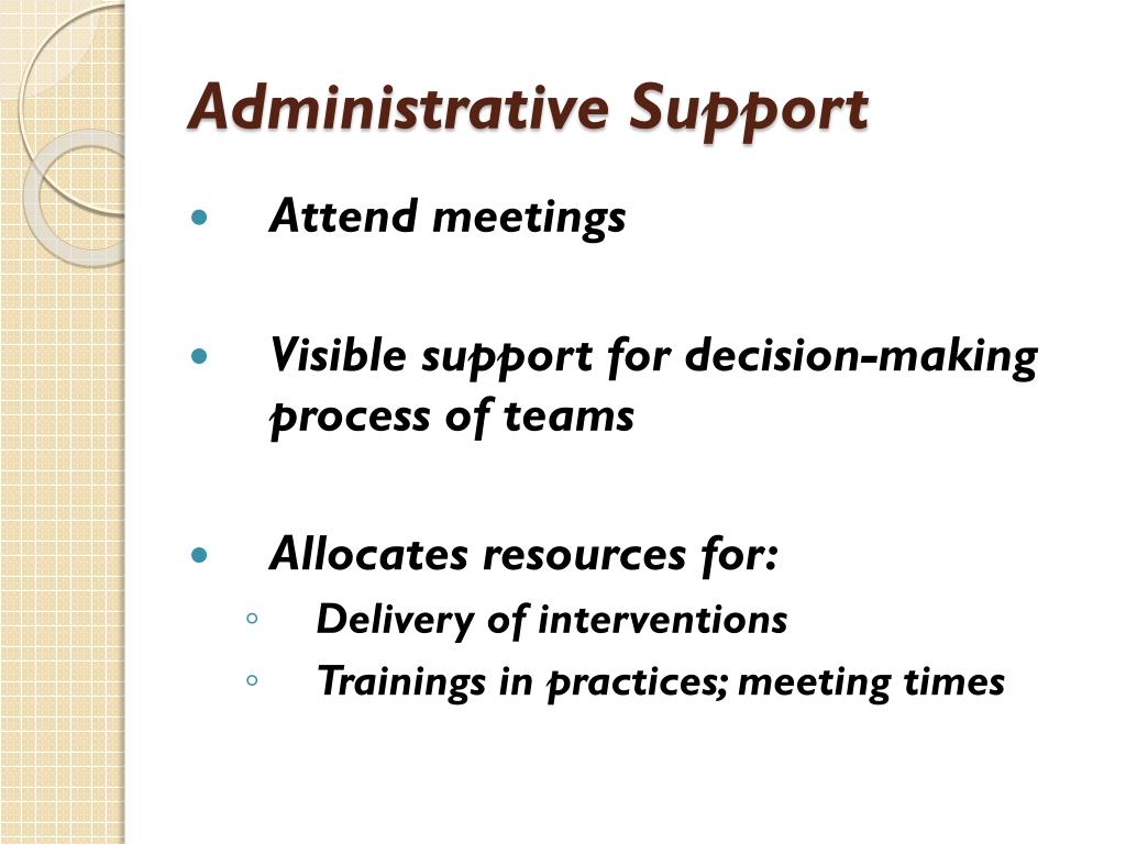 Administrative Support • Attend meetings • Visible support for decision-making process of teams • Allocates resources for: • Delivery of interventions • Trainings in practices; meeting times