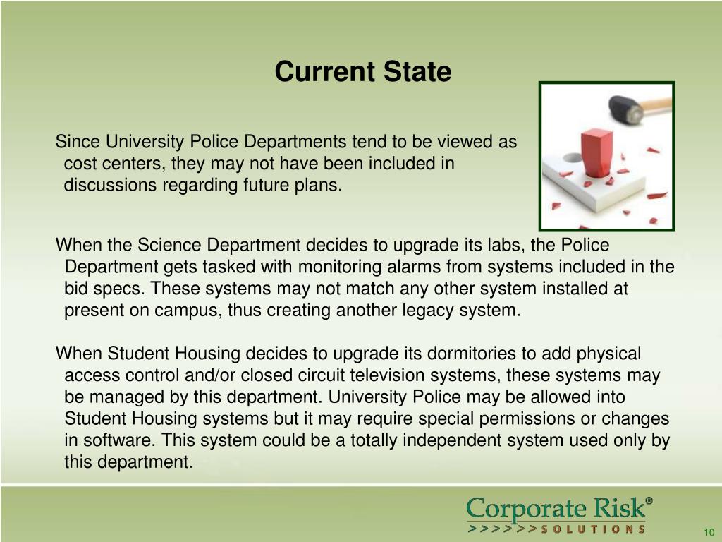 Current State Since University Police Departments tend to be viewed as cost centers, they may not have been included in discussions regarding future plans. When the Science Department decides to upgrade its labs, the Police Department gets tasked with monitoring alarms from systems included in the bid specs. These systems may not match any other system installed at present on campus, thus creating another legacy system. When Student Housing decides to upgrade its dormitories to add physical access control and/or closed circuit television systems, these systems may be managed by this department. University Police may be allowed into Student Housing systems but it may require special permissions or changes in software. This system could be a totally independent system used only by this department. 10