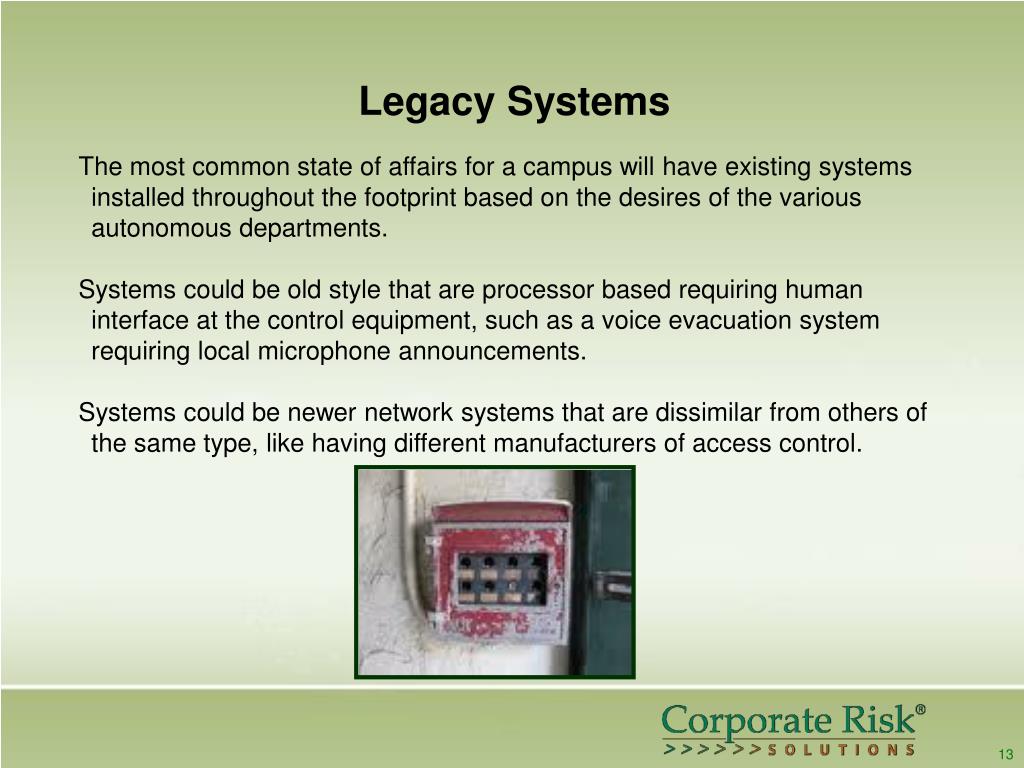 Legacy Systems The most common state of affairs for a campus will have existing systems installed throughout the footprint based on the desires of the various autonomous departments. Systems could be old style that are processor based requiring human interface at the control equipment, such as a voice evacuation system requiring local microphone announcements. Systems could be newer network systems that are dissimilar from others of the same type, like having different manufacturers of access control. 13