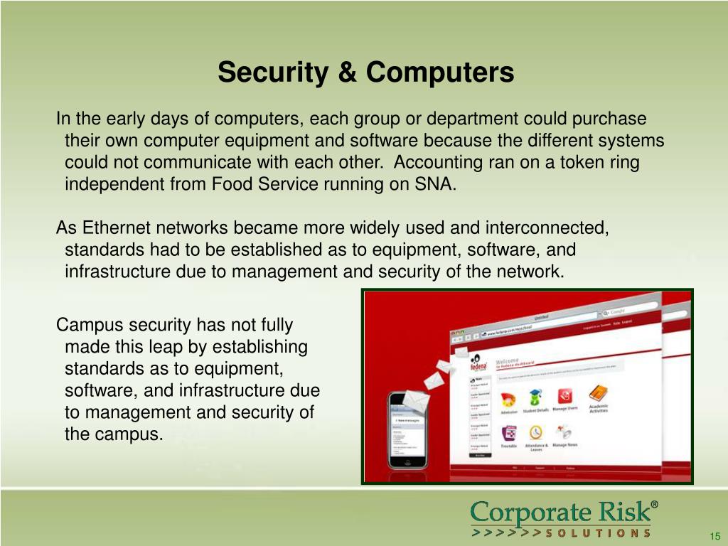 Security & Computers In the early days of computers, each group or department could purchase their own computer equipment and software because the different systems could not communicate with each other. Accounting ran on a token ring independent from Food Service running on SNA. As Ethernet networks became more widely used and interconnected, standards had to be established as to equipment, software, and infrastructure due to management and security of the network. Campus security has not fully made this leap by establishing standards as to equipment, software, and infrastructure due to management and security of the campus. 15