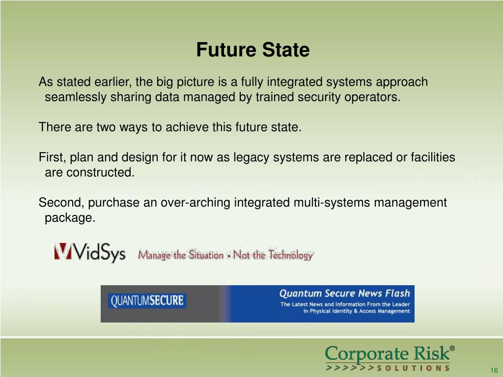 Future State As stated earlier, the big picture is a fully integrated systems approach seamlessly sharing data managed by trained security operators. There are two ways to achieve this future state. First, plan and design for it now as legacy systems are replaced or facilities are constructed. Second, purchase an over-arching integrated multi-systems management package. 16