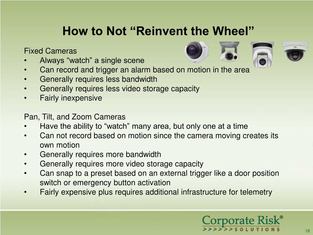 How to Not “Reinvent the Wheel” • Fixed Cameras • Always “watch” a single scene • Can record and trigger an alarm based on motion in the area • Generally requires less bandwidth • Generally requires less video storage capacity • Fairly inexpensive • Pan, Tilt, and Zoom Cameras • Have the ability to “watch” many area, but only one at a time • Can not record based on motion since the camera moving creates its own motion • Generally requires more bandwidth • Generally requires more video storage capacity • Can snap to a preset based on an external trigger like a door position switch or emergency button activation • Fairly expensive plus requires additional infrastructure for telemetry 18