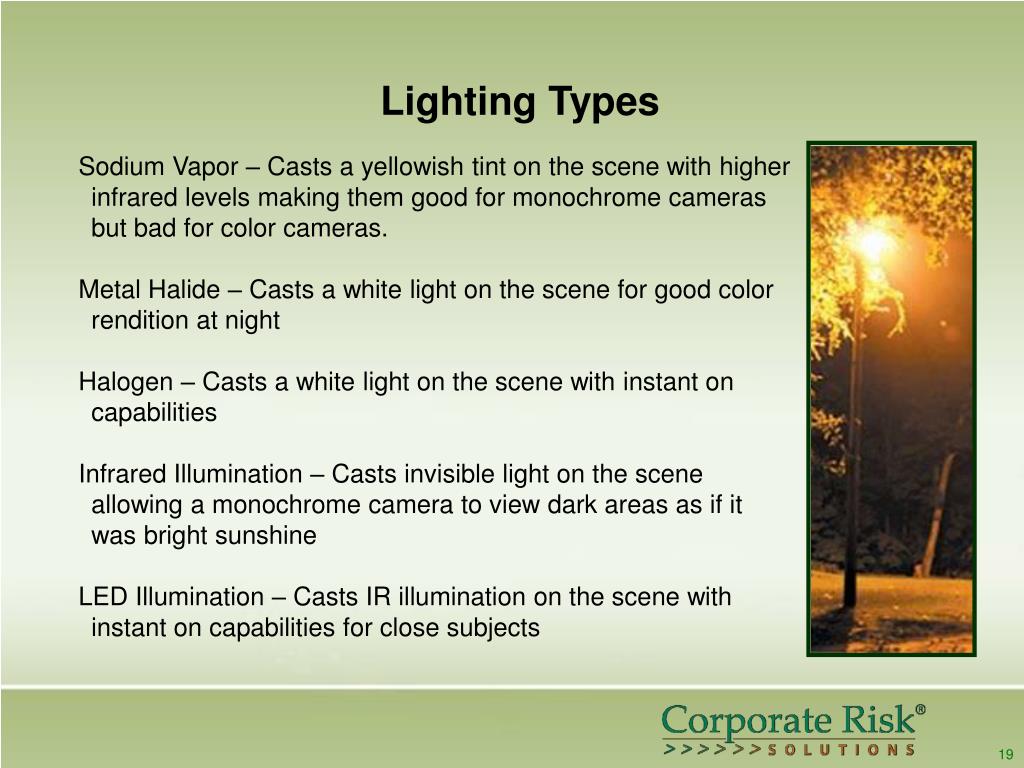Lighting Types Sodium Vapor – Casts a yellowish tint on the scene with higher infrared levels making them good for monochrome cameras but bad for color cameras. Metal Halide – Casts a white light on the scene for good color rendition at night Halogen – Casts a white light on the scene with instant on capabilities Infrared Illumination – Casts invisible light on the scene allowing a monochrome camera to view dark areas as if it was bright sunshine LED Illumination – Casts IR illumination on the scene with instant on capabilities for close subjects 19