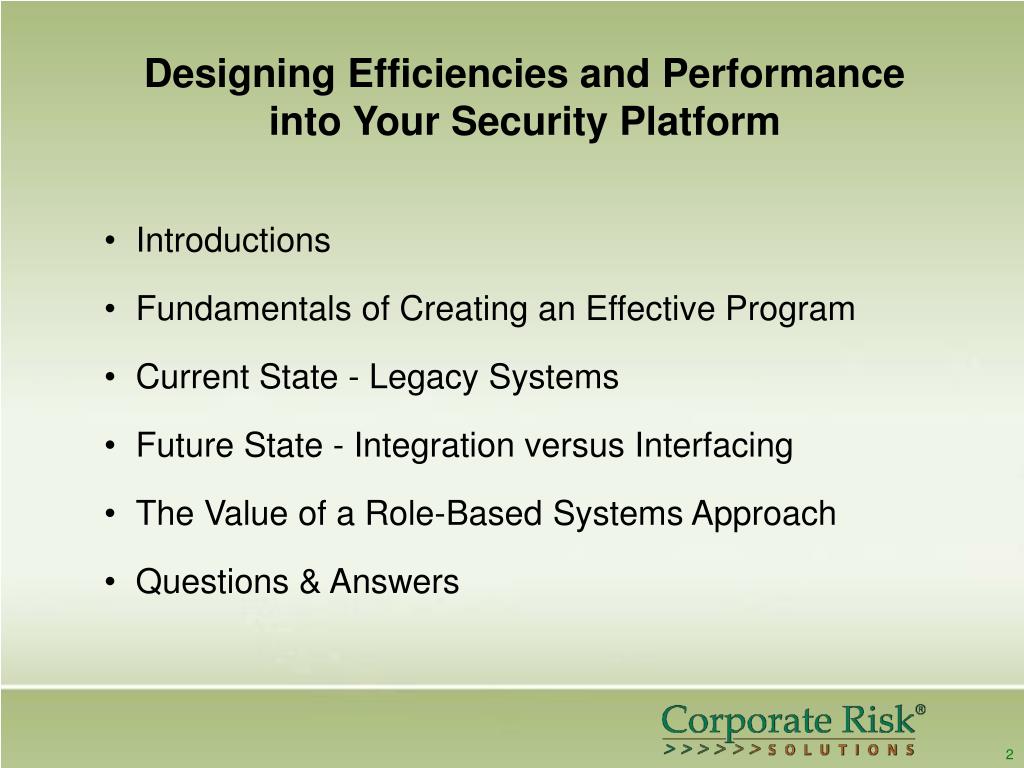 Designing Efficiencies and Performance into Your Security Platform • Introductions • Fundamentals of Creating an Effective Program • Current State - Legacy Systems • Future State - Integration versus Interfacing • The Value of a Role-Based Systems Approach • Questions & Answers 2