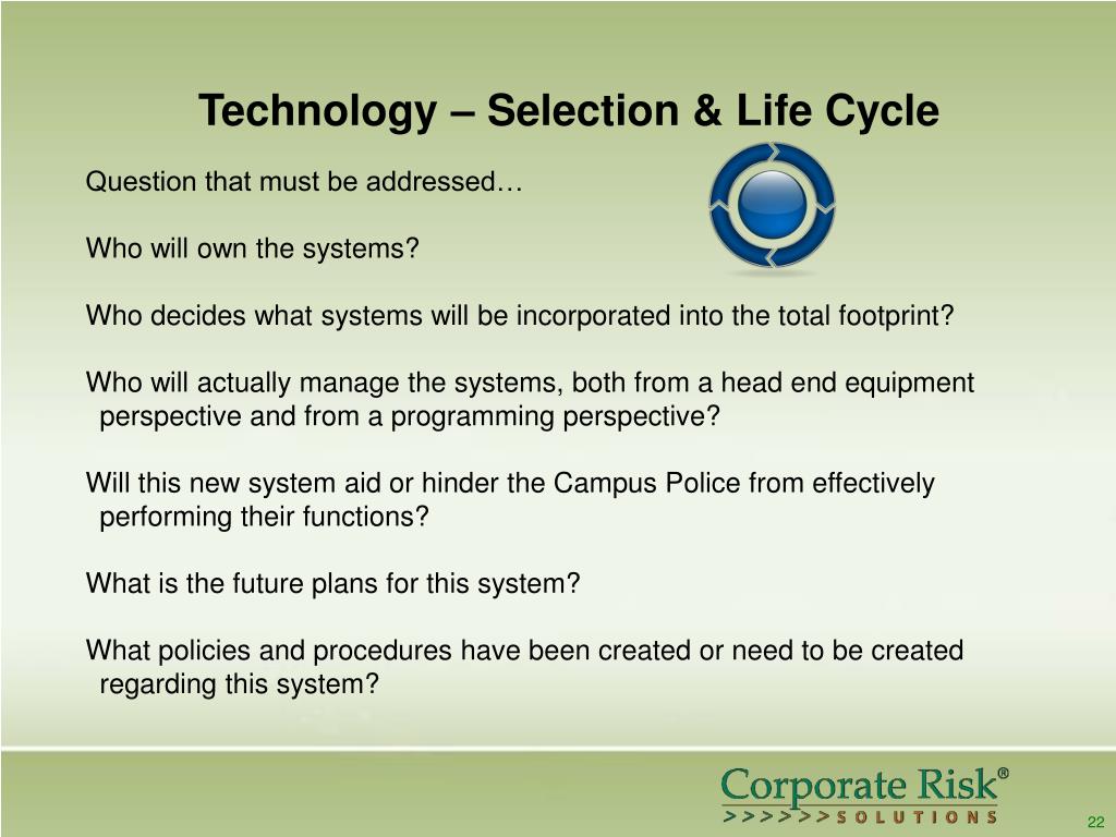 Technology – Selection & Life Cycle Question that must be addressed… Who will own the systems? Who decides what systems will be incorporated into the total footprint? Who will actually manage the systems, both from a head end equipment perspective and from a programming perspective? Will this new system aid or hinder the Campus Police from effectively performing their functions? What is the future plans for this system? What policies and procedures have been created or need to be created regarding this system? 22