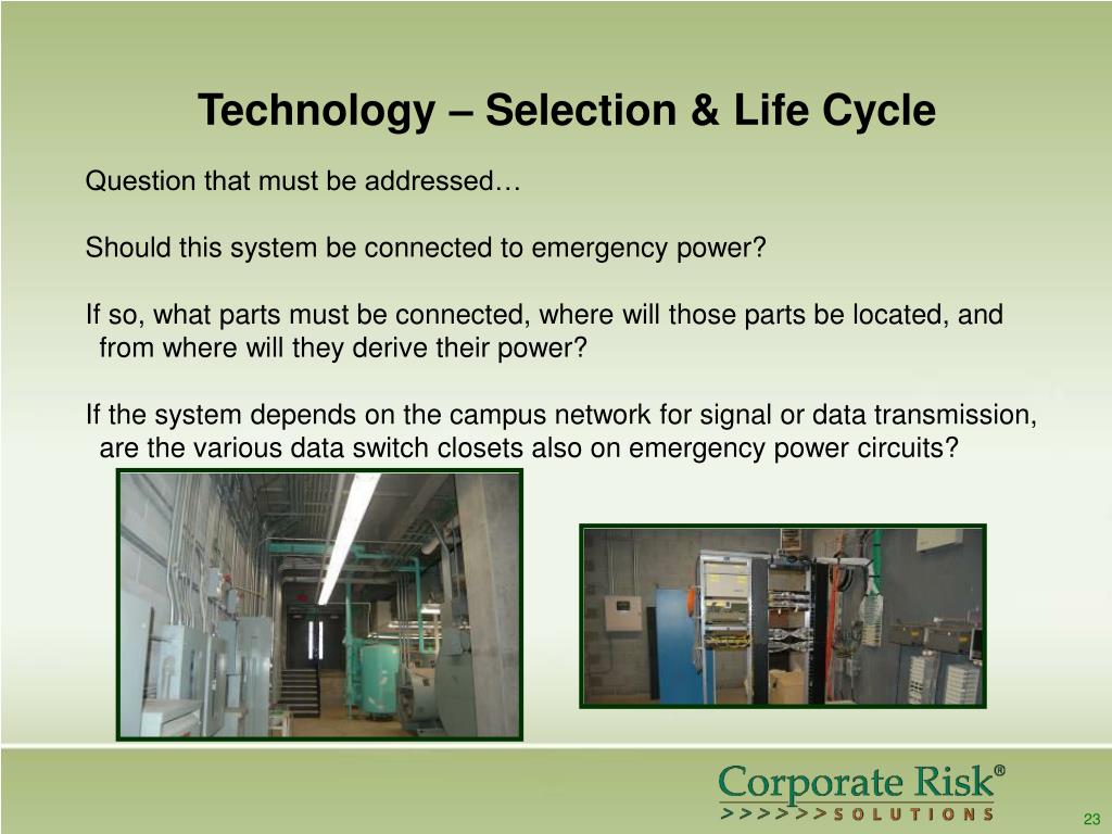 Technology – Selection & Life Cycle Question that must be addressed… Should this system be connected to emergency power? If so, what parts must be connected, where will those parts be located, and from where will they derive their power? If the system depends on the campus network for signal or data transmission, are the various data switch closets also on emergency power circuits? 23