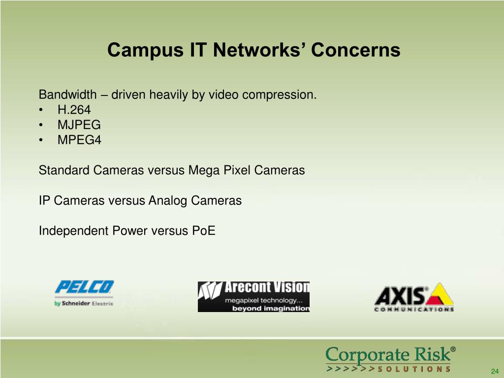 Campus IT Networks’ Concerns • Bandwidth – driven heavily by video compression. • H.264 • MJPEG • MPEG4 • Standard Cameras versus Mega Pixel Cameras • IP Cameras versus Analog Cameras • Independent Power versus PoE 24