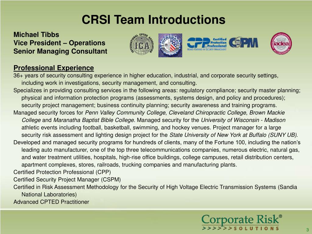 CRSI Team Introductions Michael Tibbs Vice President – Operations Senior Managing Consultant Professional Experience 36+ years of security consulting experience in higher education, industrial, and corporate security settings, including work in investigations, security management, and consulting. Specializes in providing consulting services in the following areas: regulatory compliance; security master planning; physical and information protection programs (assessments, systems design, and policy and procedures); security project management; business continuity planning; security awareness and training programs. Managed security forces for Penn Valley Community College, Cleveland Chiropractic College, Brown Mackie College and Maranatha Baptist Bible College. Managed security for the University of Wisconsin - Madison athletic events including football, basketball, swimming, and hockey venues. Project manager for a large security risk assessment and lighting design project for the State University of New York at Buffalo (SUNY UB). Developed and managed security programs for hundreds of clients, many of the Fortune 100, including the nation’s leading auto manufacturer, one of the top three telecommunications companies, numerous electric, natural gas, and water treatment utilities, hospitals, high-rise office buildings, college campuses, retail distribution centers, apartment complexes, stores, railroads, trucking companies and manufacturing plants. Certified Protection Professional (CPP) Certified Security Project Manager (CSPM) Certified in Risk Assessment Methodology for the Security of High Voltage Electric Transmission Systems (Sandia National Laboratories) Advanced CPTED Practitioner 3