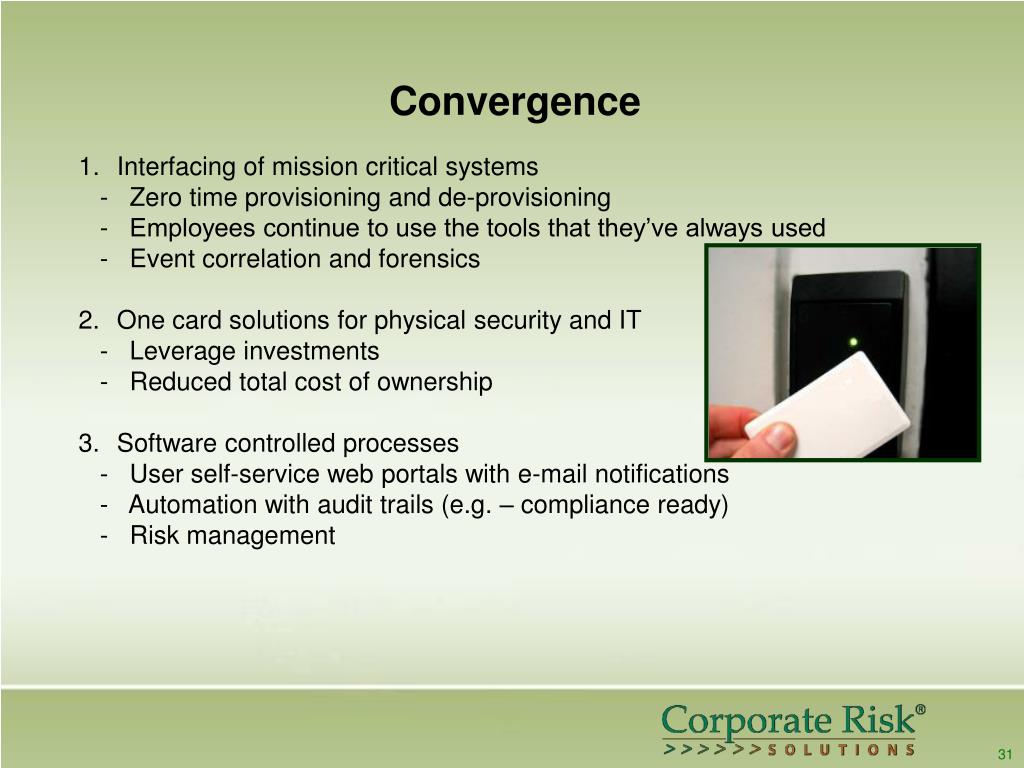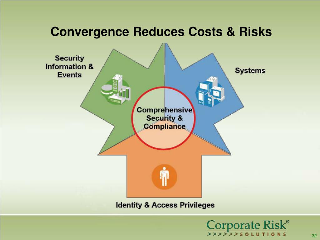 Convergence • Interfacing of mission critical systems • - Zero time provisioning and de-provisioning • - Employees continue to use the tools that they’ve always used • - Event correlation and forensics • One card solutions for physical security and IT • - Leverage investments • - Reduced total cost of ownership • Software controlled processes • - User self-service web portals with e-mail notifications • - Automation with audit trails (e.g. – compliance ready) • - Risk management 31