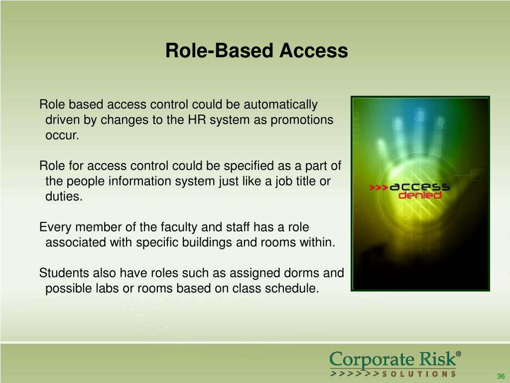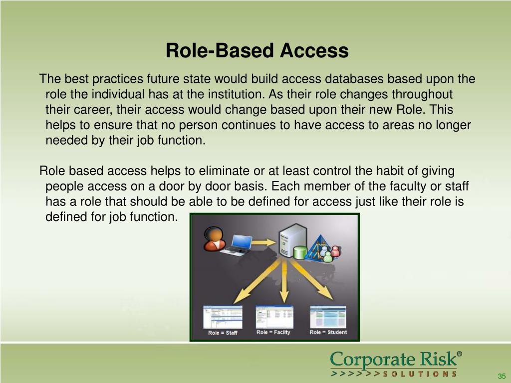 Role-Based Access The best practices future state would build access databases based upon the role the individual has at the institution. As their role changes throughout their career, their access would change based upon their new Role. This helps to ensure that no person continues to have access to areas no longer needed by their job function. Role based access helps to eliminate or at least control the habit of giving people access on a door by door basis. Each member of the faculty or staff has a role that should be able to be defined for access just like their role is defined for job function. 35