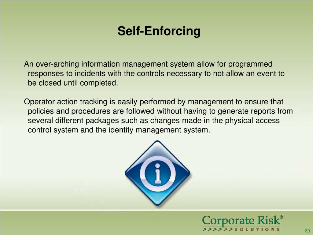 Self-Enforcing An over-arching information management system allow for programmed responses to incidents with the controls necessary to not allow an event to be closed until completed. Operator action tracking is easily performed by management to ensure that policies and procedures are followed without having to generate reports from several different packages such as changes made in the physical access control system and the identity management system. 39
