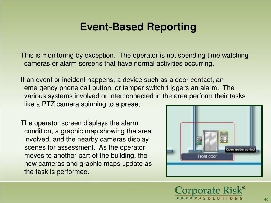 Event-Based Reporting This is monitoring by exception. The operator is not spending time watching cameras or alarm screens that have normal activities occurring. If an event or incident happens, a device such as a door contact, an emergency phone call button, or tamper switch triggers an alarm. The various systems involved or interconnected in the area perform their tasks like a PTZ camera spinning to a preset. The operator screen displays the alarm condition, a graphic map showing the area involved, and the nearby cameras display scenes for assessment. As the operator moves to another part of the building, the new cameras and graphic maps update as the task is performed. 40