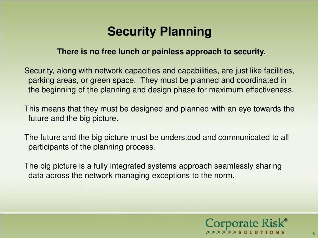 Security Planning There is no free lunch or painless approach to security. Security, along with network capacities and capabilities, are just like facilities, parking areas, or green space. They must be planned and coordinated in the beginning of the planning and design phase for maximum effectiveness. This means that they must be designed and planned with an eye towards the future and the big picture. The future and the big picture must be understood and communicated to all participants of the planning process. The big picture is a fully integrated systems approach seamlessly sharing data across the network managing exceptions to the norm. 5