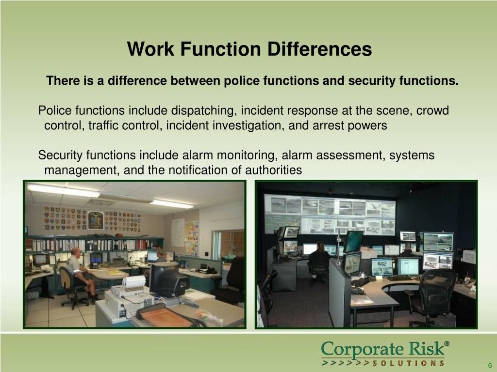 Work Function Differences There is a difference between police functions and security functions. Police functions include dispatching, incident response at the scene, crowd control, traffic control, incident investigation, and arrest powers Security functions include alarm monitoring, alarm assessment, systems management, and the notification of authorities 6