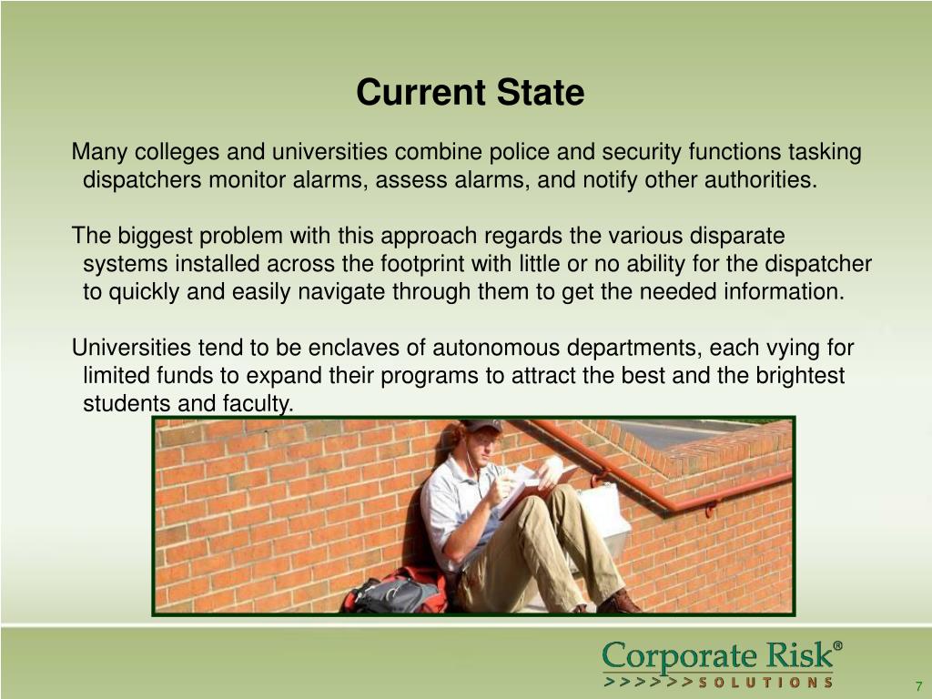 Current State Many colleges and universities combine police and security functions tasking dispatchers monitor alarms, assess alarms, and notify other authorities. The biggest problem with this approach regards the various disparate systems installed across the footprint with little or no ability for the dispatcher to quickly and easily navigate through them to get the needed information. Universities tend to be enclaves of autonomous departments, each vying for limited funds to expand their programs to attract the best and the brightest students and faculty. 7