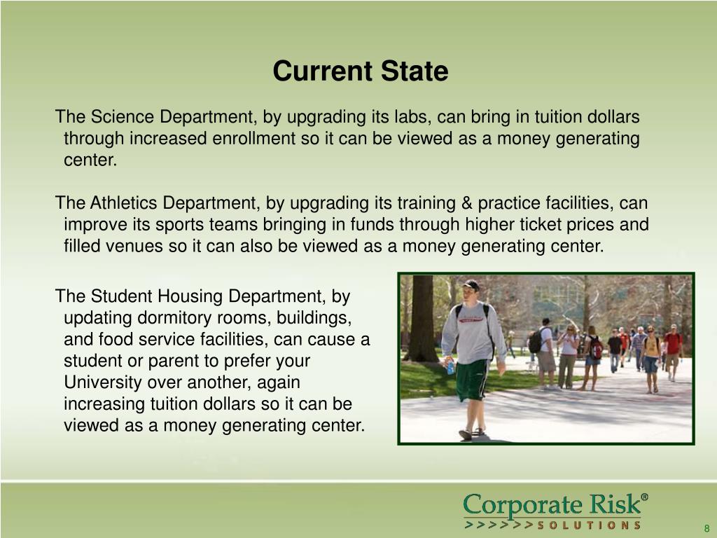 Current State The Science Department, by upgrading its labs, can bring in tuition dollars through increased enrollment so it can be viewed as a money generating center. The Athletics Department, by upgrading its training & practice facilities, can improve its sports teams bringing in funds through higher ticket prices and filled venues so it can also be viewed as a money generating center. The Student Housing Department, by updating dormitory rooms, buildings, and food service facilities, can cause a student or parent to prefer your University over another, again increasing tuition dollars so it can be viewed as a money generating center. 8