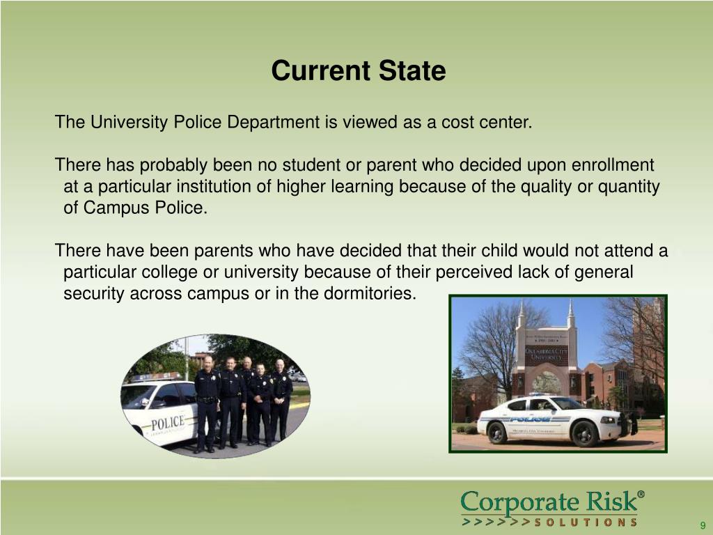 Current State The University Police Department is viewed as a cost center. There has probably been no student or parent who decided upon enrollment at a particular institution of higher learning because of the quality or quantity of Campus Police. There have been parents who have decided that their child would not attend a particular college or university because of their perceived lack of general security across campus or in the dormitories. 9