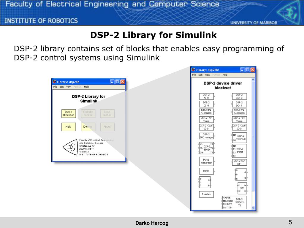 DSP-2 Library for Simulink DSP-2 library contains set of blocks that enables easy programming of DSP-2 control systems using Simulink Darko Hercog