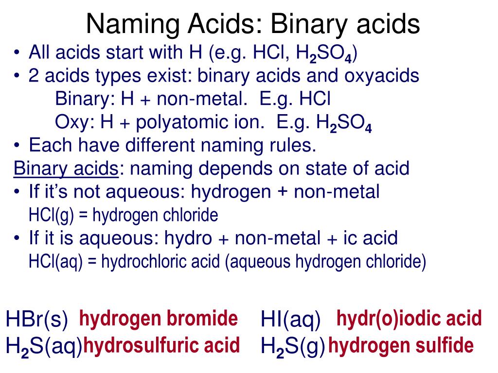 Naming Compounds. Naming Acids: Binary acids. All acids start with H (e.g. HCl , H 2 SO 4 ) 2 acids types exist: binary acids and oxyacids Binary: H + non-metal. E.g. HCl Oxy: H + polyatomic ion. E.g. H 2 SO 4 Each have different naming rules.
