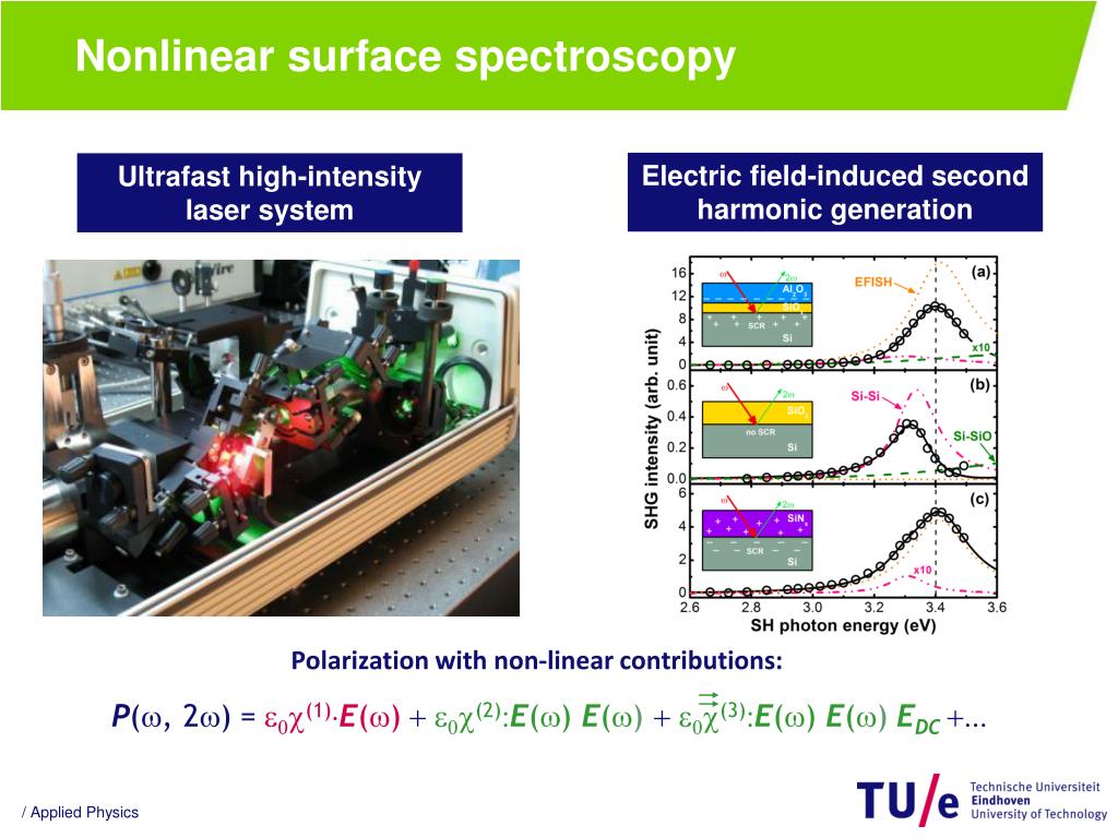 Nonlinear surface spectroscopy P(w, 2w)=e0c(1)E(w)+e0c(2):E(w) E(w)+e0c(3):E(w) E(w)EDC +... Electric field-induced second harmonic generation Ultrafast high-intensity laser system Polarization with non-linear contributions: / Applied Physics