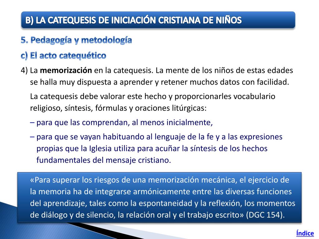 B) La catequesis de Iniciación cristiana de niños • 5. Pedagogía y metodología • c) El acto catequético • 4) La memorización en la catequesis. La mente de los niños de estas edades se halla muy dispuesta a aprender y retener muchos datos con facilidad. • La catequesis debe valorar este hecho y proporcionarles vocabulario religioso, síntesis, fórmulas y oraciones litúrgicas: • para que las comprendan, al menos inicialmente, • para que se vayan habituando al lenguaje de la fe y a las expresiones propias que la Iglesia utiliza para acuñar la síntesis de los hechos fundamentales del mensaje cristiano. «Para superar los riesgos de una memorización mecánica, el ejercicio de la memoria ha de integrarse armónicamente entre las diversas funciones del aprendizaje, tales como la espontaneidad y la reflexión, los momentos de diálogo y de silencio, la relación oral y el trabajo escrito» (DGC 154). Índice