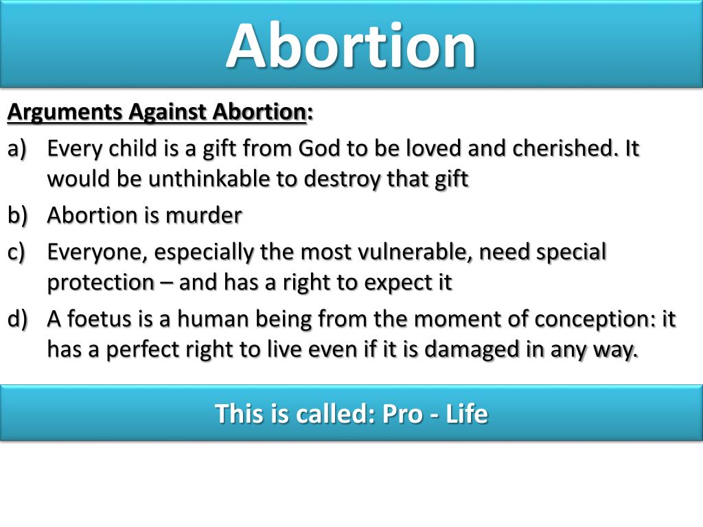 Abortion Arguments Against Abortion: • Every child is a gift from God to be loved and cherished. It would be unthinkable to destroy that gift • Abortion is murder • Everyone, especially the most vulnerable, need special protection – and has a right to expect it • A foetus is a human being from the moment of conception: it has a perfect right to live even if it is damaged in any way. This is called: Pro - Life