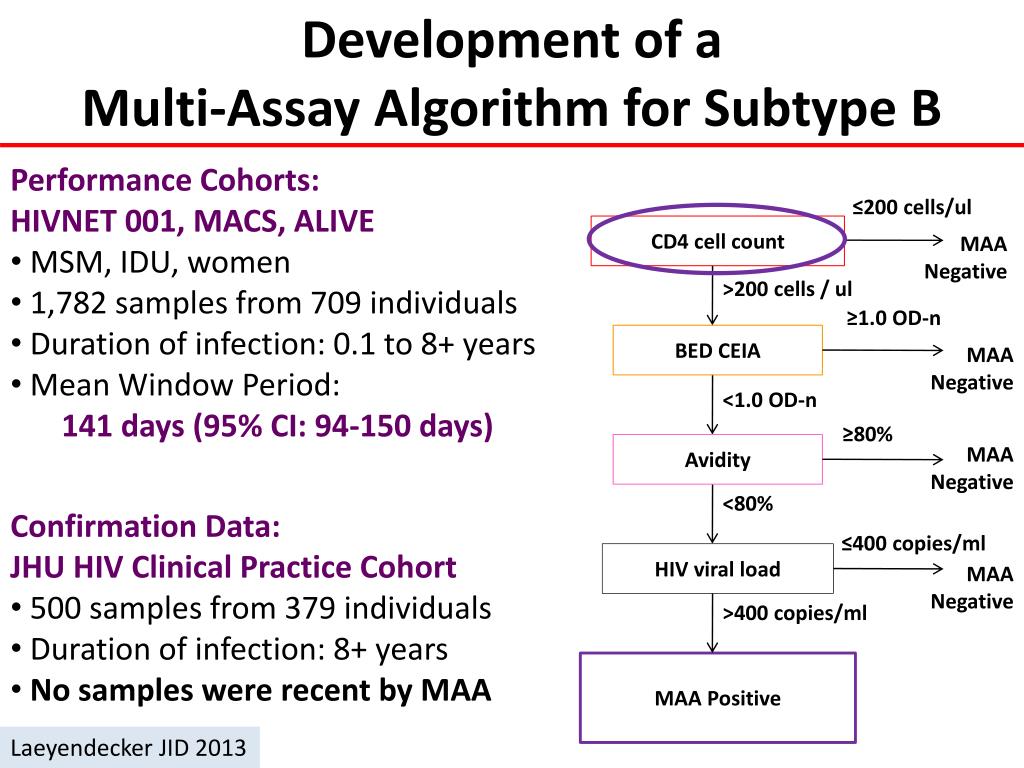 Development of a Multi-Assay Algorithm for Subtype B ≤200 cells/ul CD4 cell count MAA Negative >200 cells / ul • Performance Cohorts: • HIVNET 001, MACS, ALIVE • MSM, IDU, women • 1,782 samples from 709 individuals • Duration of infection: 0.1 to 8+ years • Mean Window Period: • 141 days (95% CI: 94-150 days) ≥1.0 OD-n BED CEIA MAA Negative <1.0 OD-n ≥80% Avidity MAA Negative <80% ≤400 copies/ml HIV viral load MAA Negative >400 copies/ml MAA Positive • Confirmation Data: • JHU HIV Clinical Practice Cohort • 500 samples from 379 individuals • Duration of infection: 8+ years • No samples were recent by MAA Laeyendecker JID 2013