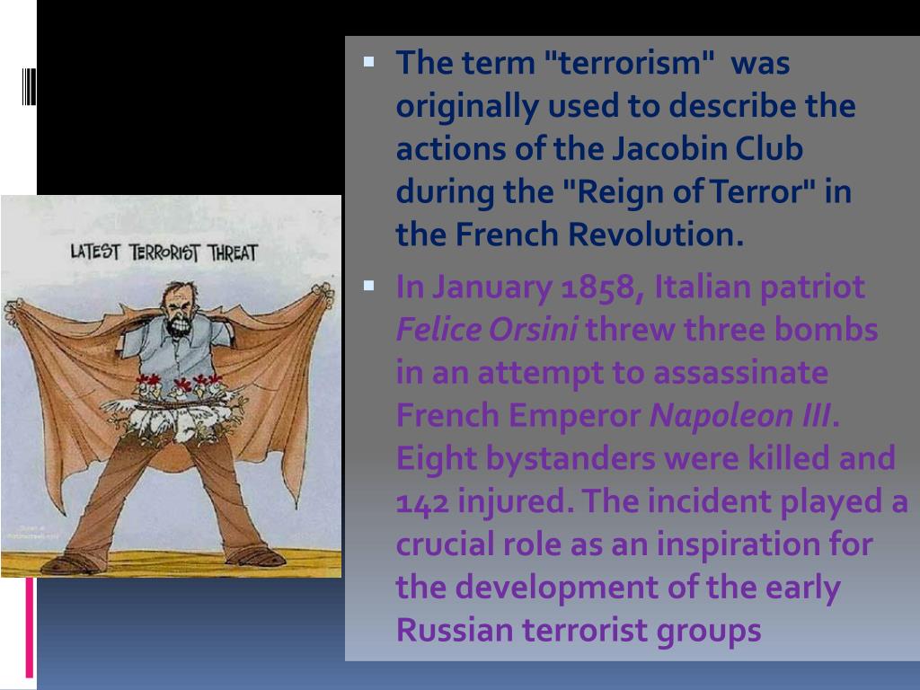 The term "terrorism" was originally used to describe the actions of the Jacobin Club during the "Reign of Terror" in the French Revolution. • In January 1858, Italian patriot FeliceOrsinithrew three bombs in an attempt to assassinate French Emperor Napoleon III. Eight bystanders were killed and 142 injured. The incident played a crucial role as an inspiration for the development of the early Russian terrorist groups