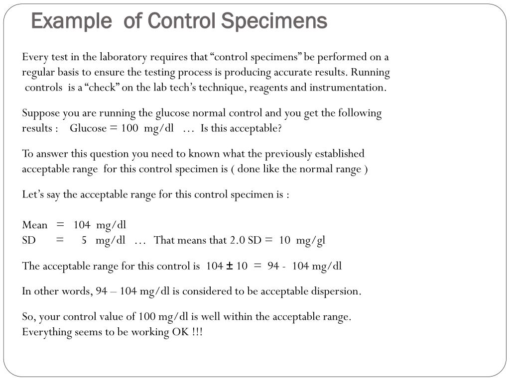 Example of Control Specimens Every test in the laboratory requires that “control specimens” be performed on a regular basis to ensure the testing process is producing accurate results. Running controls is a “check” on the lab tech’s technique, reagents and instrumentation. Suppose you are running the glucose normal control and you get the following results : Glucose = 100 mg/dl … Is this acceptable? To answer this question you need to known what the previously established acceptable range for this control specimen is ( done like the normal range ) Let’s say the acceptable range for this control specimen is : Mean = 104 mg/dl SD = 5 mg/dl … That means that 2.0 SD = 10 mg/gl The acceptable range for this control is 104 ± 10 = 94 - 104 mg/dl In other words, 94 – 104 mg/dl is considered to be acceptable dispersion. So, your control value of 100 mg/dl is well within the acceptable range. Everything seems to be working OK !!!