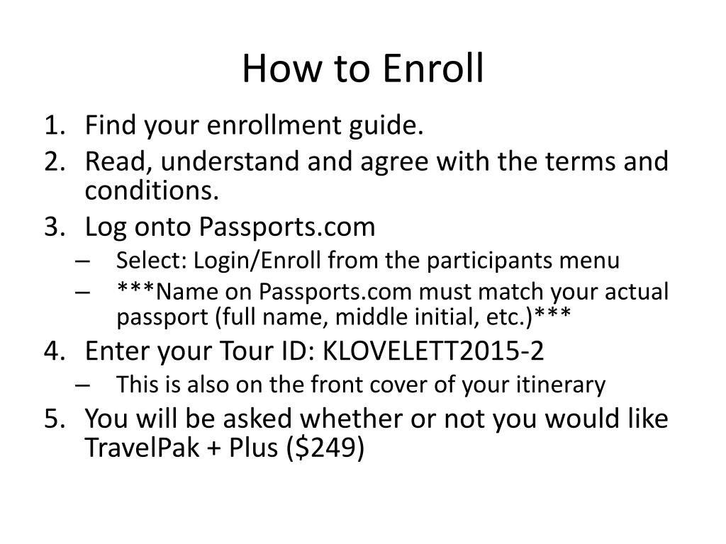 How to Enroll • Find your enrollment guide. • Read, understand and agree with the terms and conditions. • Log onto Passports.com • Select: Login/Enroll from the participants menu • ***Name on Passports.com must match your actual passport (full name, middle initial, etc.)*** • Enter your Tour ID: KLOVELETT2015-2 • This is also on the front cover of your itinerary • You will be asked whether or not you would like TravelPak + Plus ($249)